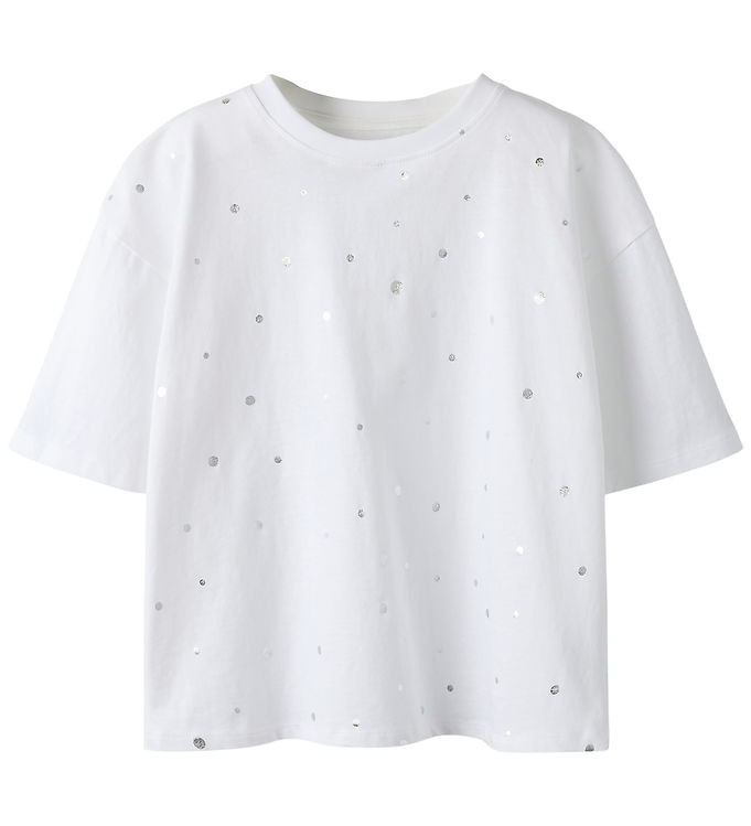 Hvide t-shirts med perler eller pailetter: For dem, der ønsker lidt mere glam, findes der også hvide t-shirts pyntet med perler, pailletter eller andre dekorative elementer. Disse t-shirts kan være et godt valg til mere festlige lejligheder.